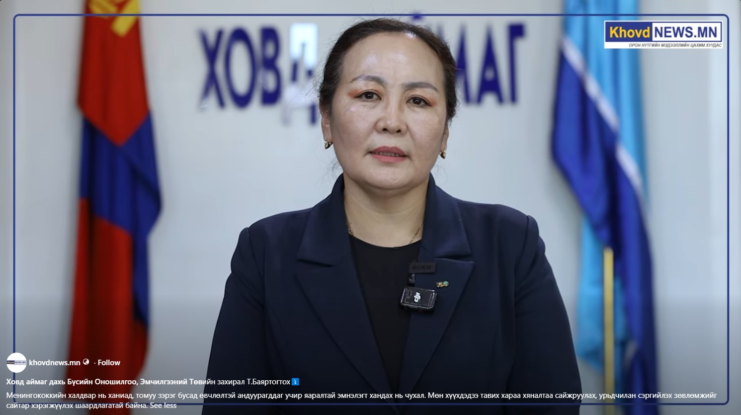 Ховд аймаг дахь Бүсийн Оношилгоо, Эмчилгээний Төвийн захирал Т.Баяртогтох: Менингококкийн халдвар нь ханиад, томуу зэрэг бусад өвчлөлтэй андуурагддаг учир яаралтай эмнэлэгт хандах нь чухал.